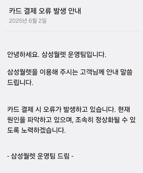 2025년 5월 31일 오전 7시경부터 약 2시간 이상 삼성페이 결제 오류가 발생했습니다.